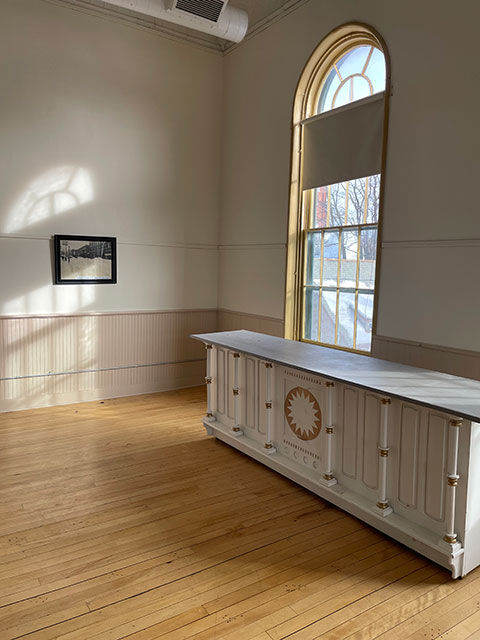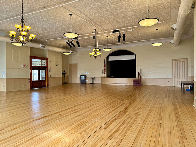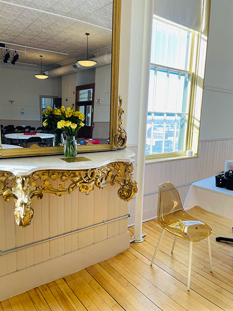 Make your special day historic. Saint Albans Museum is a stunning example of Victorian architecture with intricate brickwork, tall windows, and decorative cornices exemplifying the architectural details of the Civil War era. Host your micro-wedding, rehearsal dinner, reception, or shower on our third floor in the gorgeous Bliss Memorial Auditorium. Fully accessible by elevator, this beautiful room with a neutral palette overlooks Taylor Park, mountain views, and the city skyline of Saint Albans. With a capacity of 175, The Bliss Room is spacious and filled with lovely natural light. Boasting high ceilings with pressed tin tiles, hardwood floors, and elegant gilded mirrors, the space can be transformed to support any mood or theme. Hire your own caterer to make use of our full kitchen and charming architectural salvage bar with gilded accents.